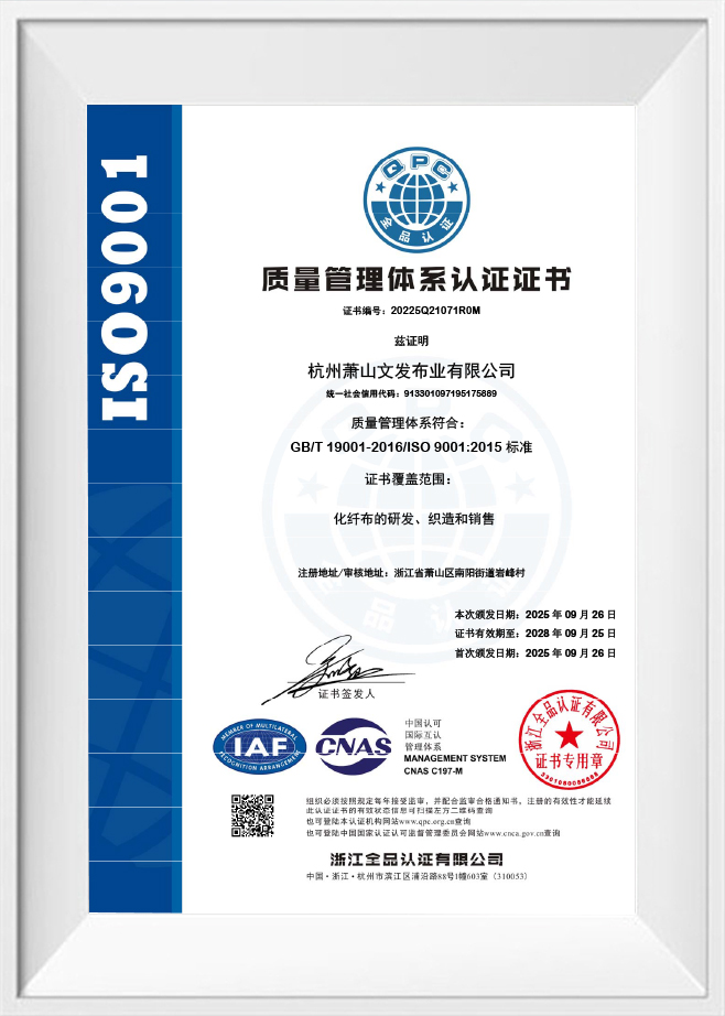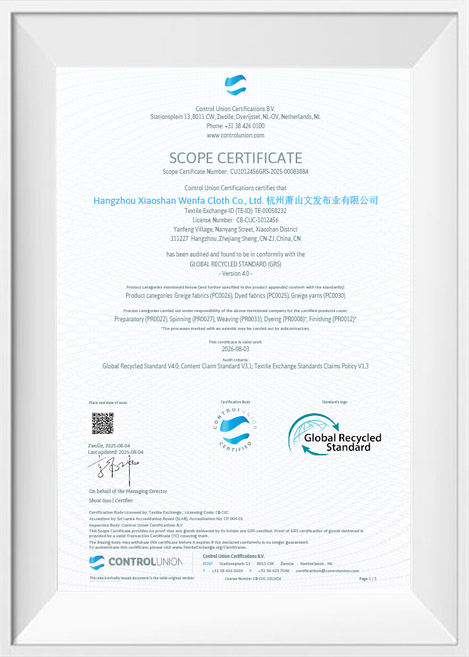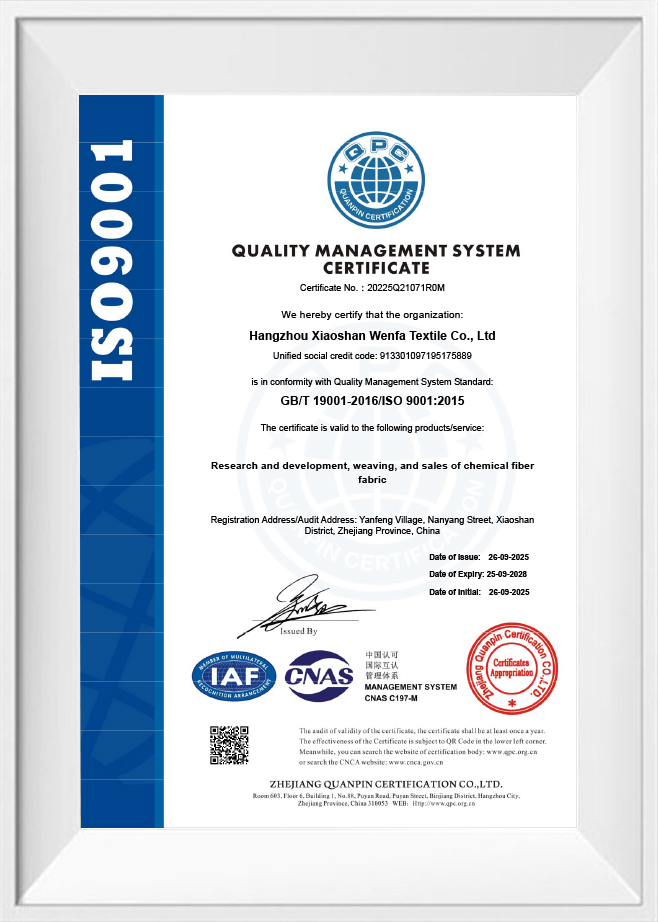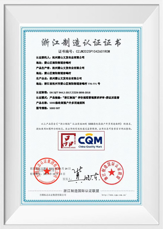 Wenfa Textile은 ISO 인증을 받았으며 REACH, GRS 및 OBP와 같은 글로벌 표준을 충족하여 직물이 엄격한 품질 및 지속 가능성 요구 사항을 충족하도록 보장합니다. 품질과 혁신에 대한 헌신으로 인해 수하물, 아웃도어 장비, 아동용 제품을 포함한 다양한 분야의 기업이 선호하는 선택이 되었습니다.